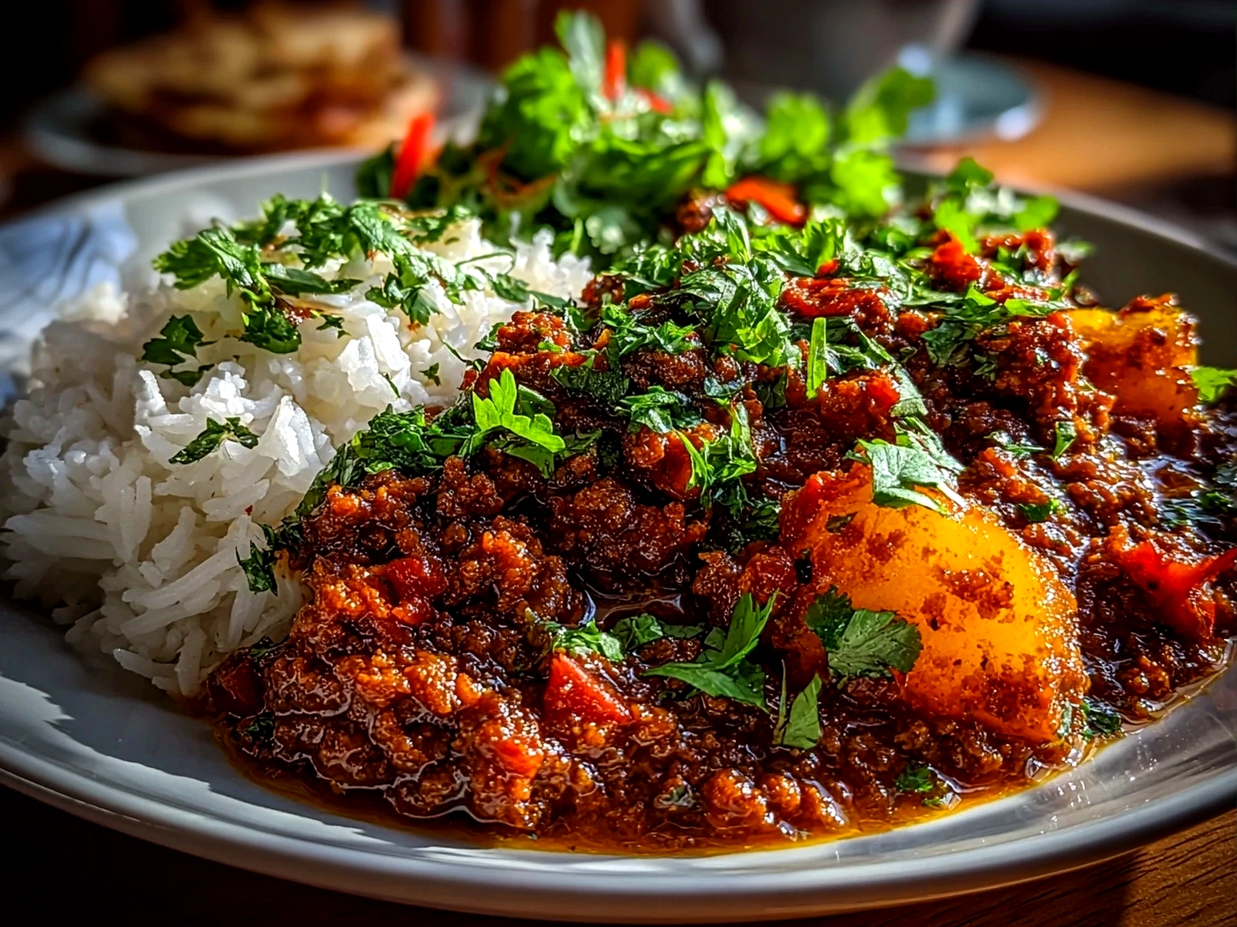 Aloo Keema Curry is a flavorful Indian dish combining minced meat and potatoes simmered in a rich, spiced tomato gravy, perfect for a comforting meal.