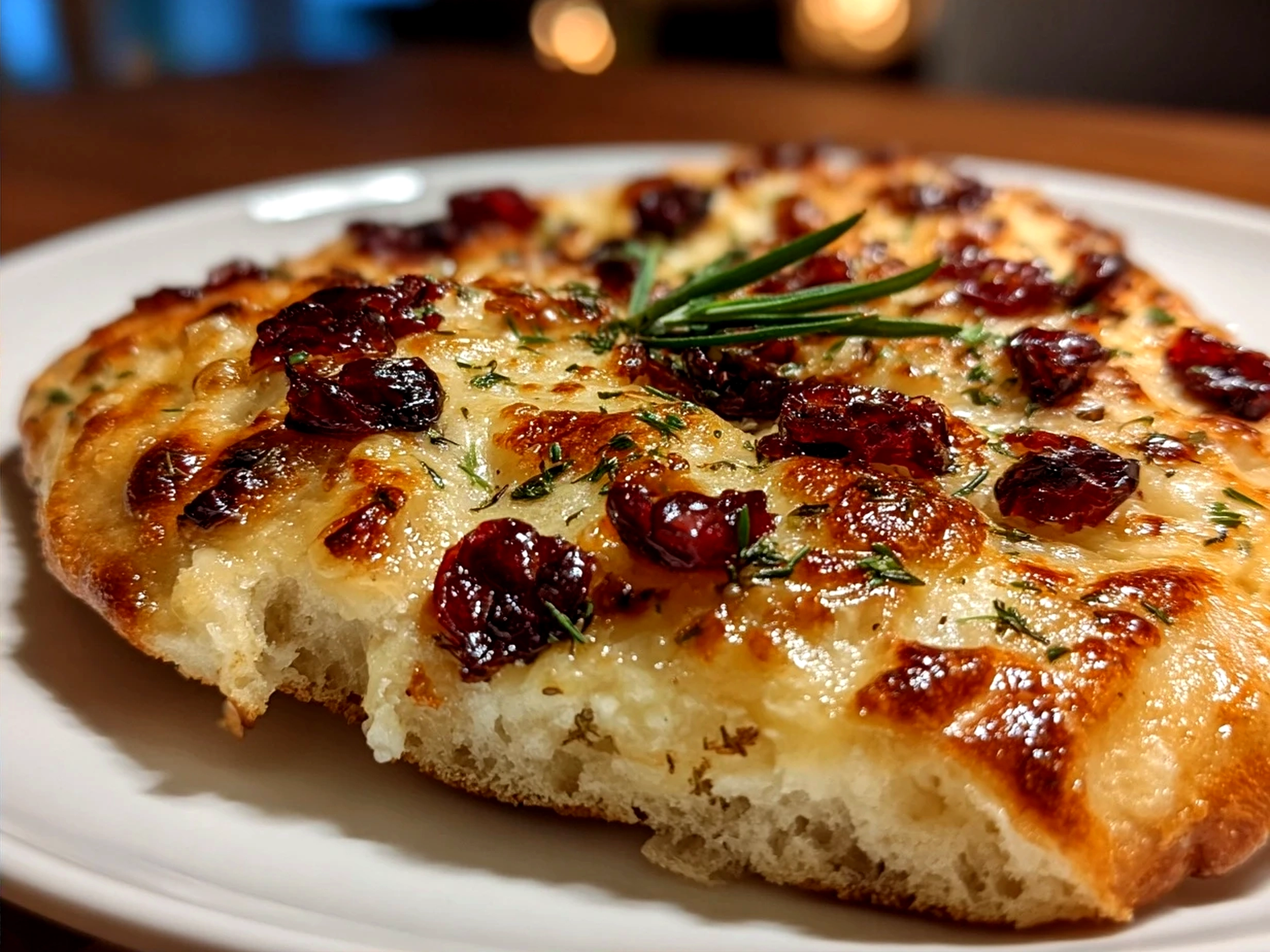 This Cranberry Brie Flatbread combines creamy brie cheese and tangy cranberries atop a crispy flatbread base, making a perfect appetizer or light snack with a balance of savory and sweet flavors.