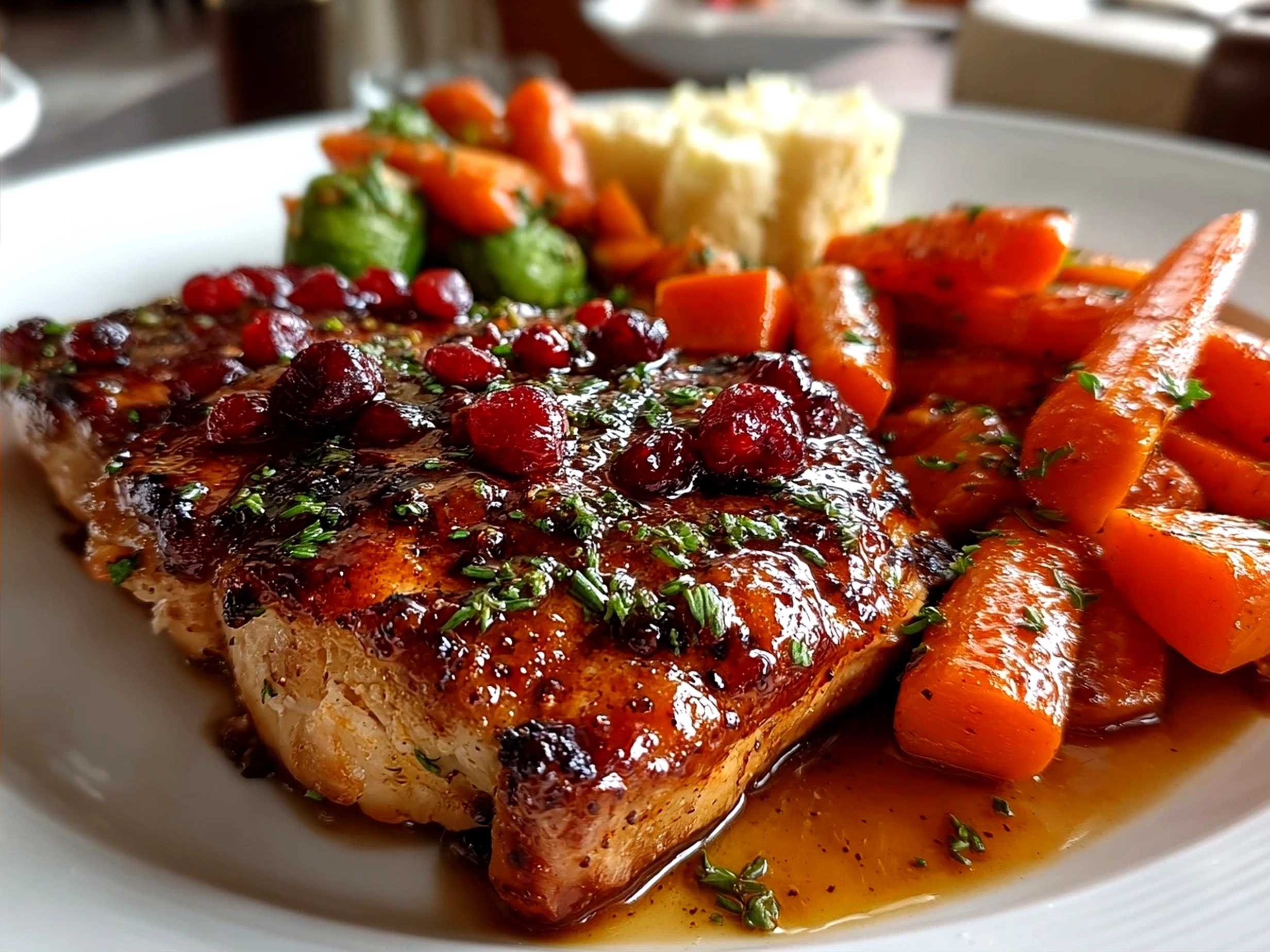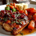 A deliciously savory and sweet cranberry glazed chicken served with tender roasted carrots and sweet potatoes, perfect for a wholesome dinner.
