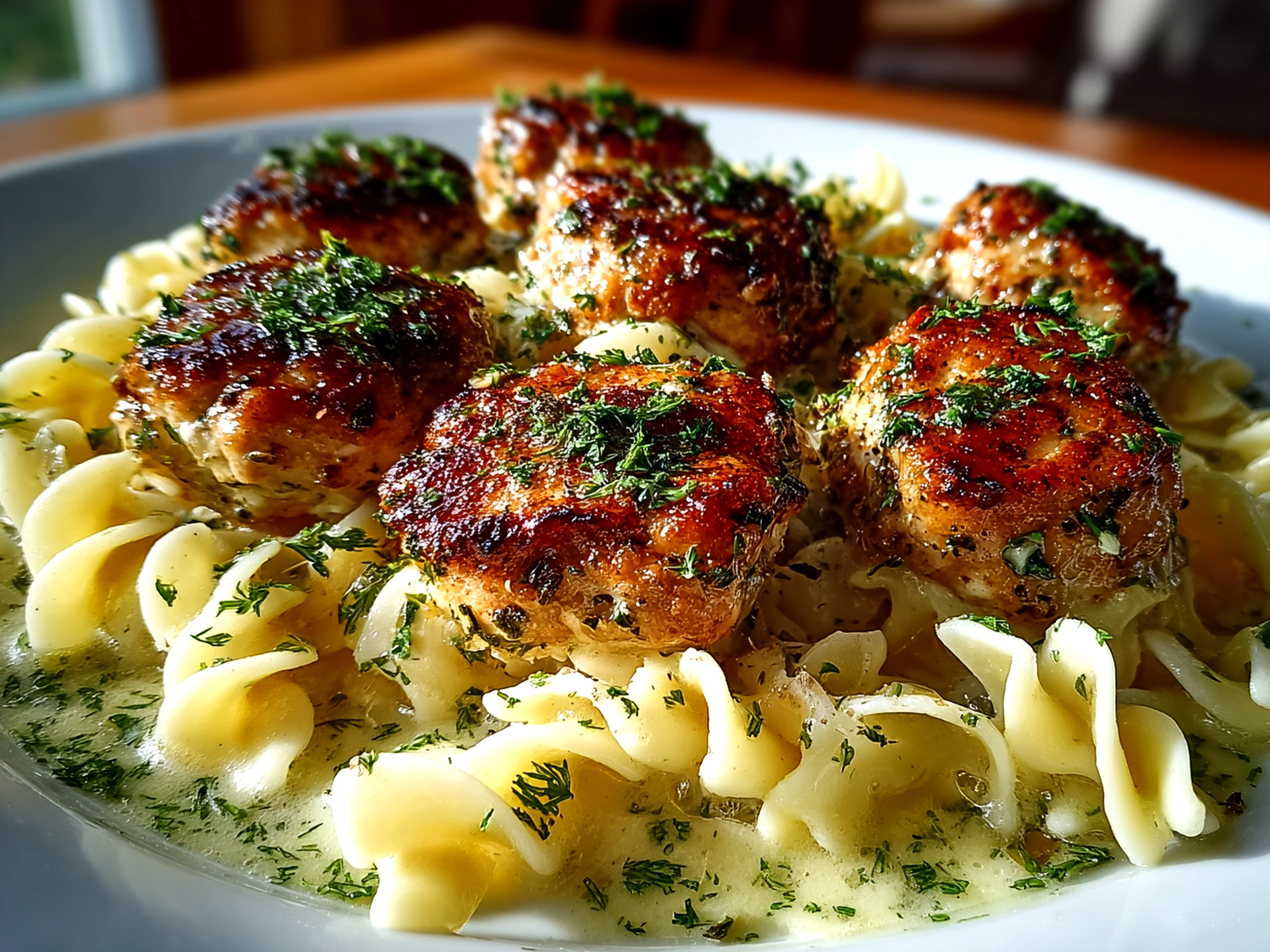 Savory garlic butter chicken meatballs served atop a bed of creamy Parmesan pasta, creating a comforting and flavorful meal perfect for dinner.