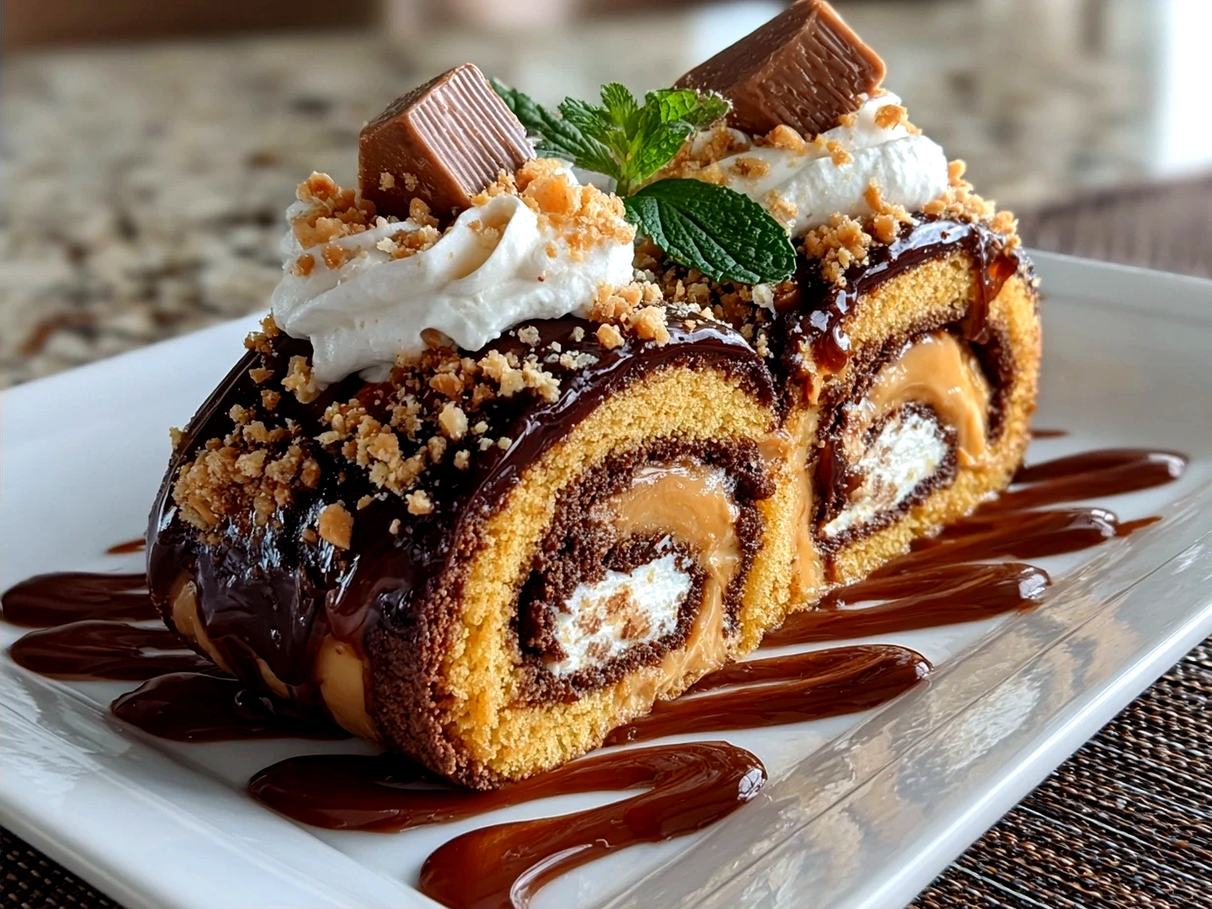 A decadent and creamy dessert featuring rich chocolate sponge rolled with a luscious peanut butter cup filling, perfect for chocolate and peanut butter lovers alike.