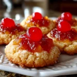 - Place the filled dough balls onto the prepared baking sheet, spacing them about 2 inches apart. Optionally, press a halved maraschino cherry on top of each cookie.