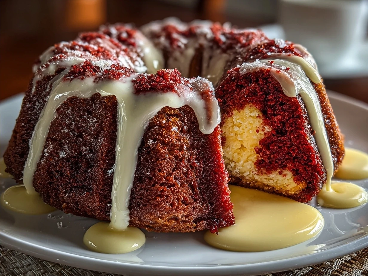 A moist and tender red velvet bundt cake layered with a smooth cream cheese filling and topped with a luscious cream cheese glaze, perfect for any special occasion or dessert craving.