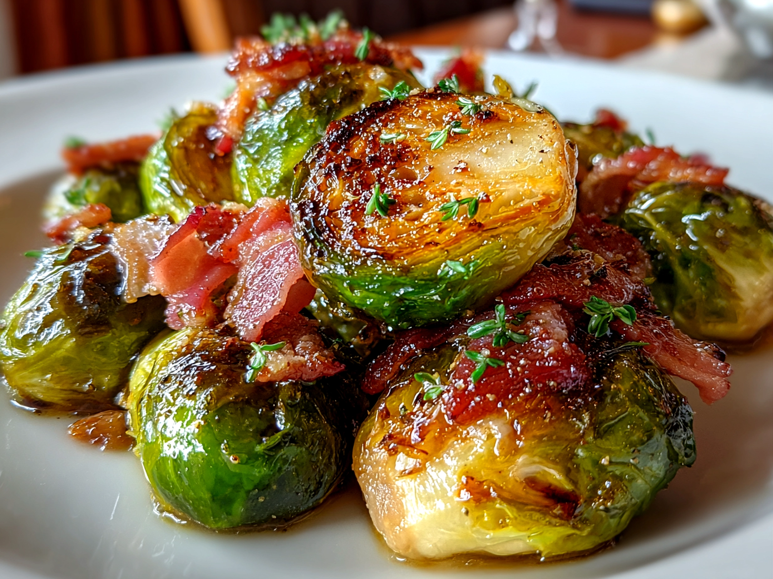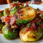 Crispy roasted Brussels sprouts tossed with savory bacon and finished with a rich balsamic glaze, making a perfect savory side dish for any meal.