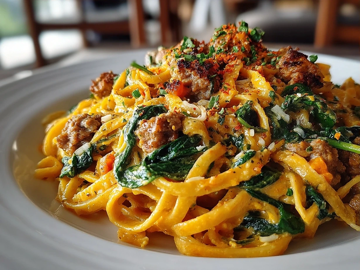 A hearty and flavorful pasta dish featuring roasted butternut squash, savory sausage, and fresh spinach, perfect for a cozy dinner.