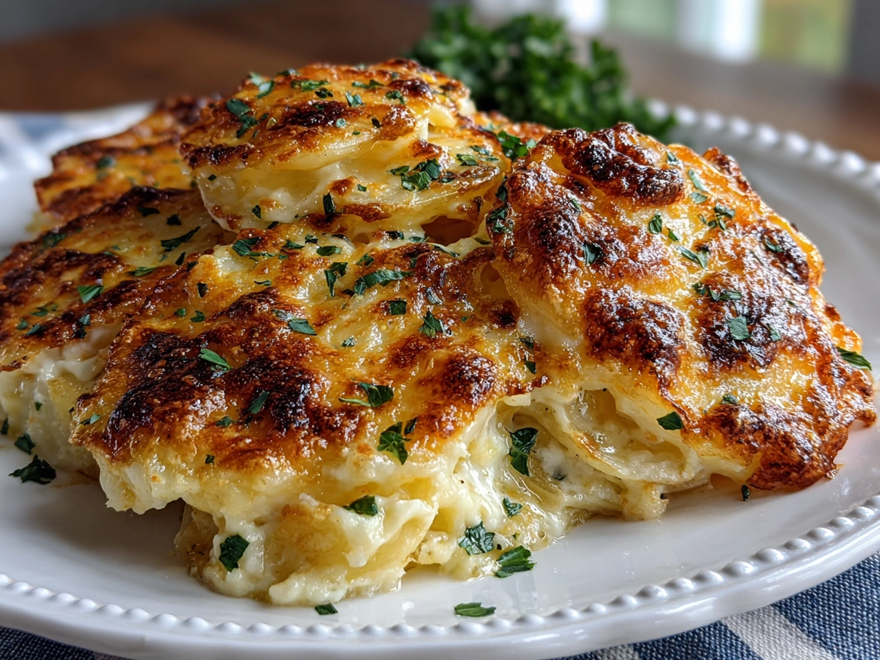 Classic scalloped potatoes featuring tender sliced potatoes baked in a creamy, cheesy sauce perfect as a comforting side dish.