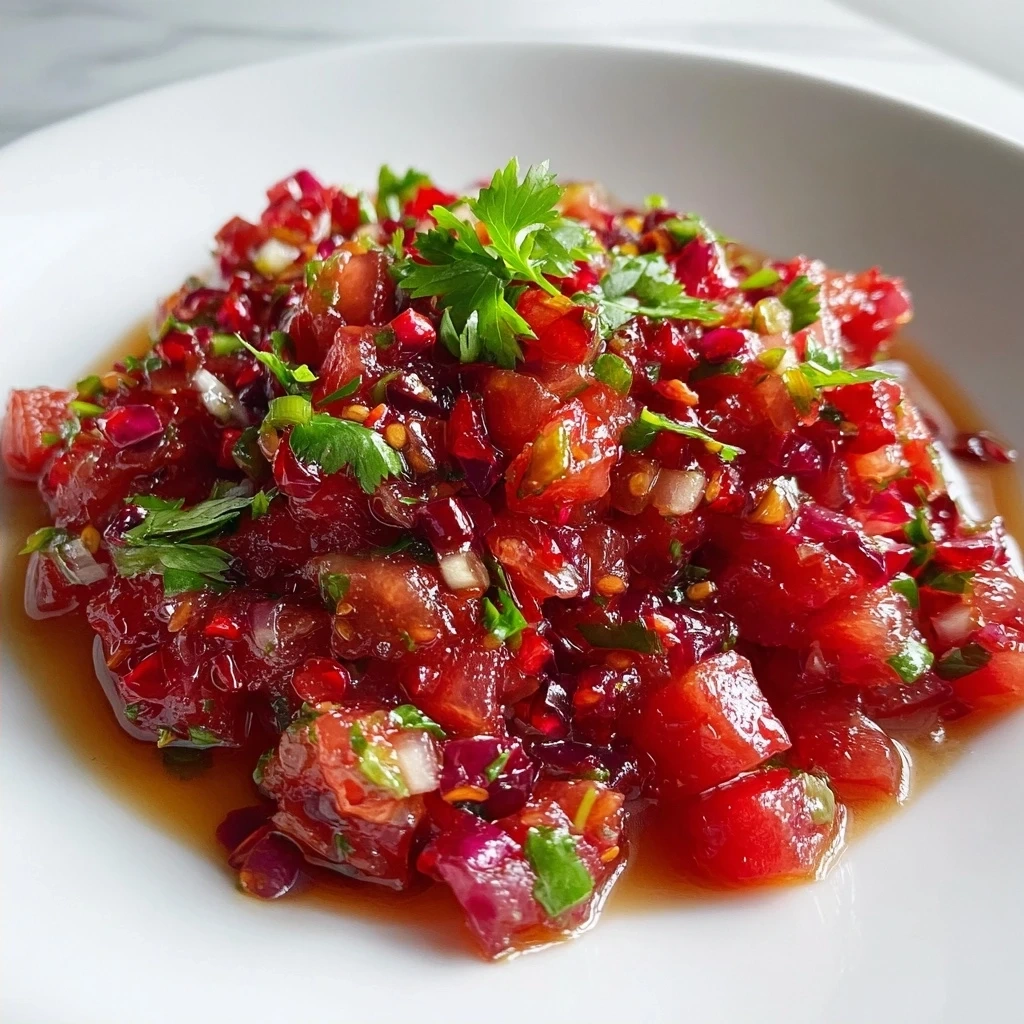 This vibrant spicy cranberry salsa is a festive and flavorful condiment perfect for holiday gatherings. It combines the tartness of cranberries with the heat of jalapeños for a delicious sweet and spicy kick.