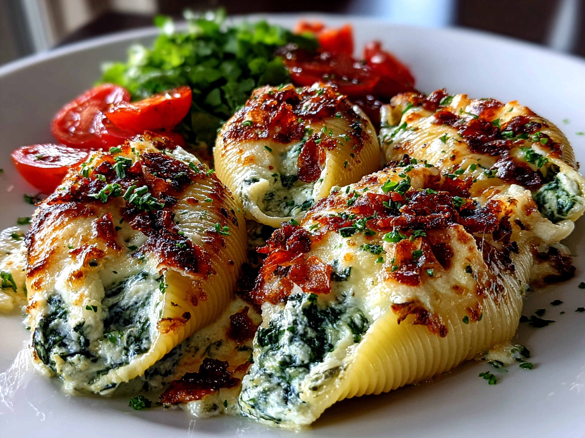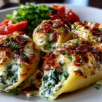 Delicious baked pasta shells stuffed with creamy ricotta and nutritious spinach, topped with marinara sauce and melted cheese for a comforting Italian meal.