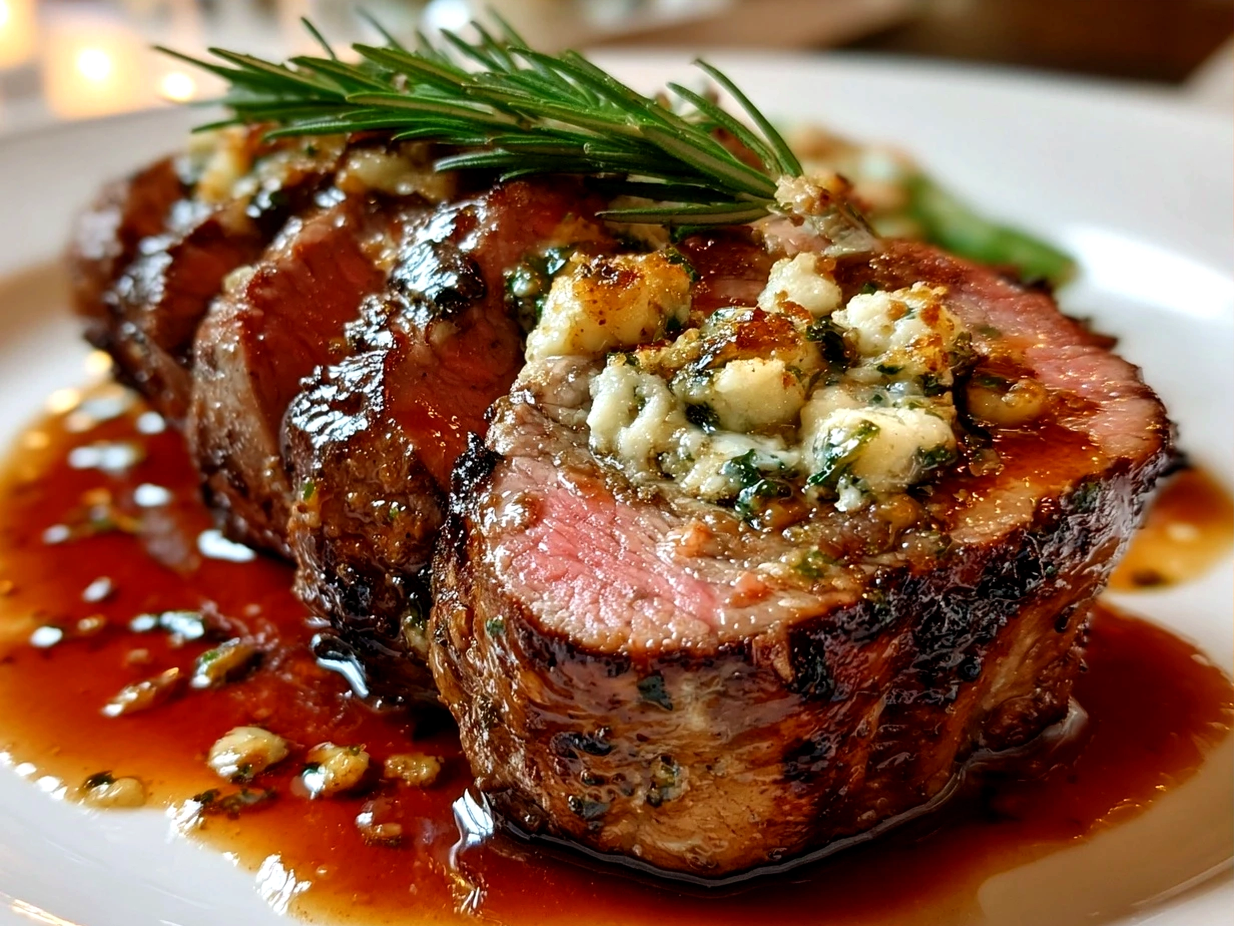 A succulent beef tenderloin stuffed with flavorful herbs, garlic, and cheese, perfect for an elegant dinner or special occasion.