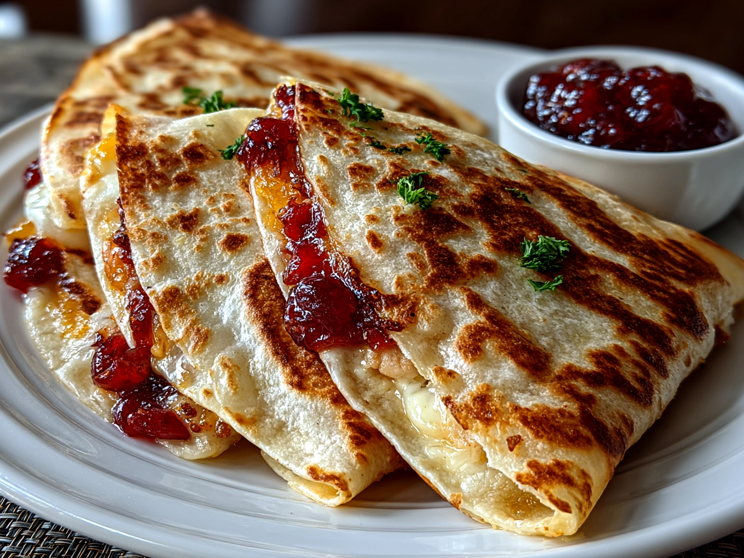 Delight in these Turkey Cranberry Quesadillas, combining savory turkey with sweet cranberry for a festive twist on a classic quesadilla perfect for a quick meal or snack.