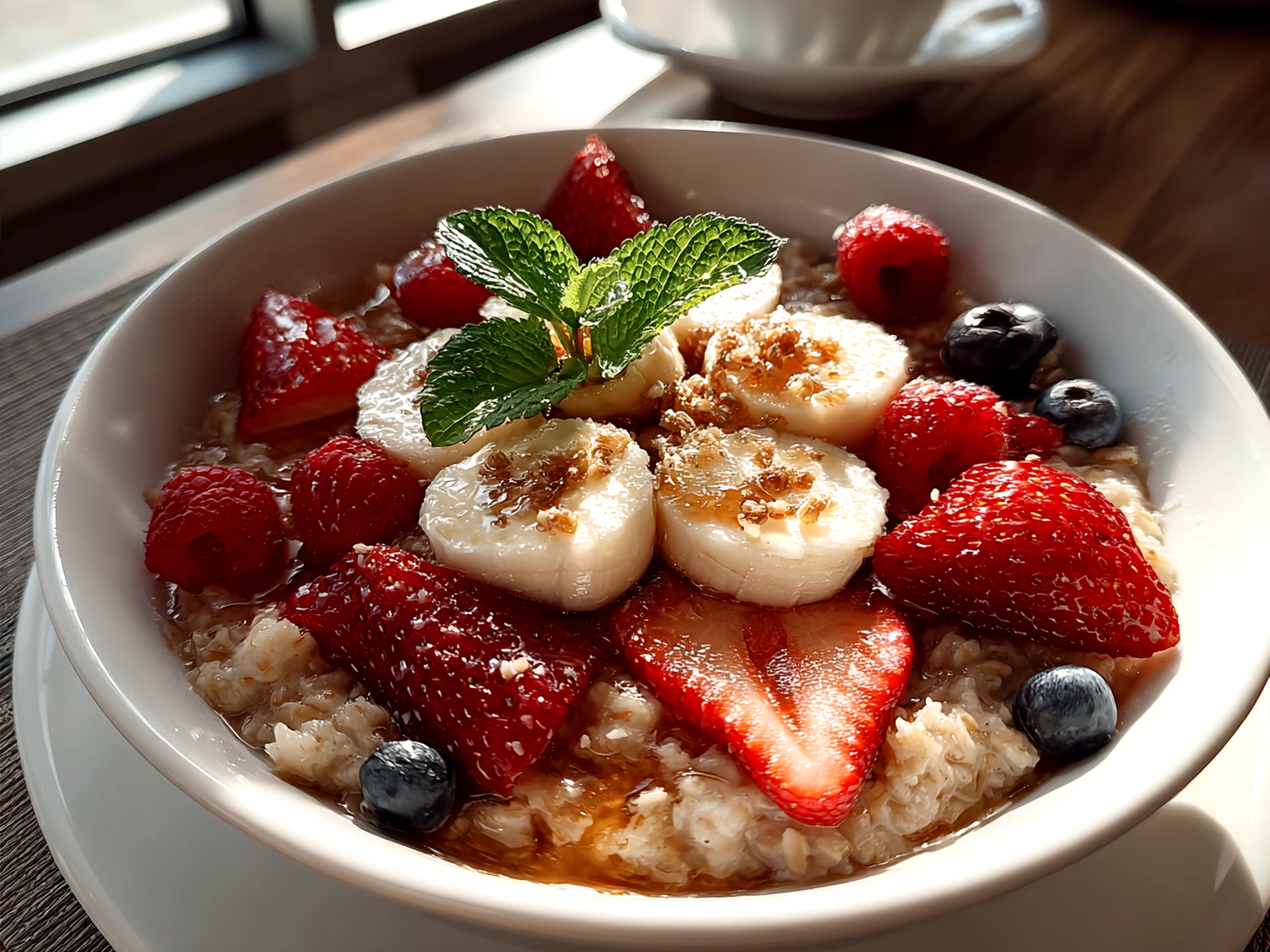 - Top with your berry masterpiece – a mix of fresh or thawed frozen blueberries, strawberries, and raspberries. This berry topped oatmeal adds fresh brightness that pops against the warm oats.