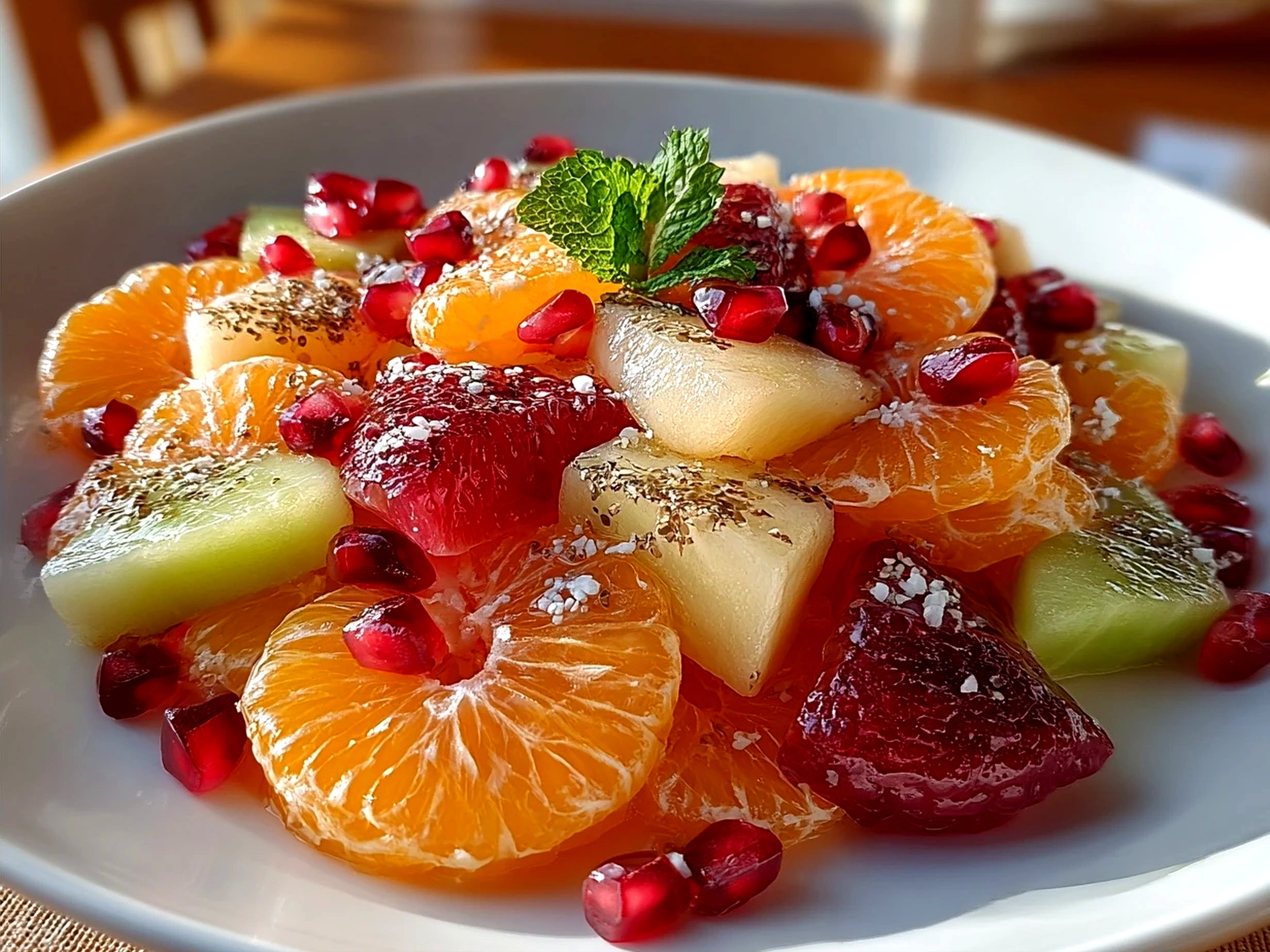 A refreshing and vibrant winter fruit salad combining seasonal fruits with a light citrus dressing, perfect for a healthy snack or side dish.